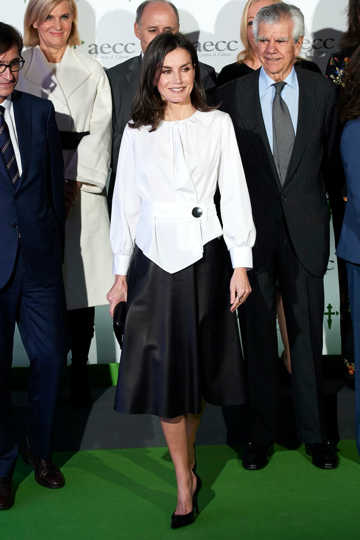 Aunque parezca que la falda es una prenda que no va con el reglamento de vestimenta de la realeza, Letizia la portó con elegancia al combinarla con unos stilettos negros.