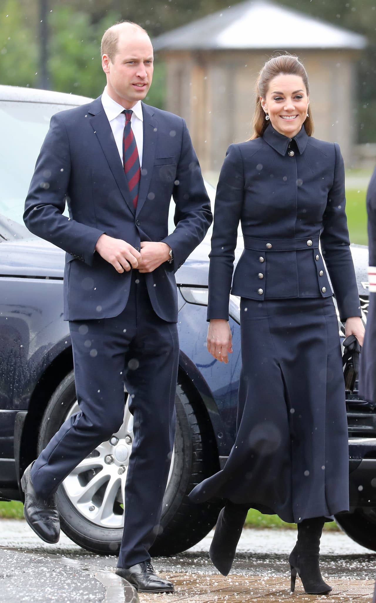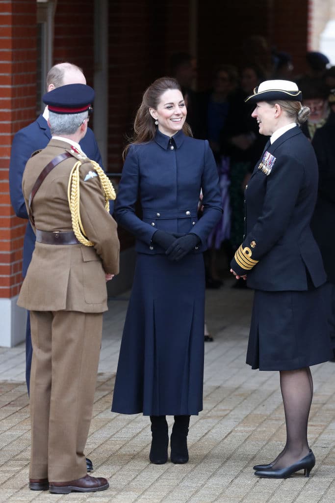 La Duquesa de Cambridge apostó por una chaqueta azul navy estilo militar, que combinó con una falda larga del mismo color.