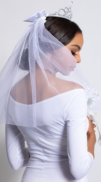 Esta creación es de la marca de lencería Yandy. Al igual que el vestido de Meghan, cuenta con un escote a los hombros, pero más pronunciado. Las mangas 3/4 son un poco más cortas que las originales y, evidentemente, la falda y el velo también lo son.