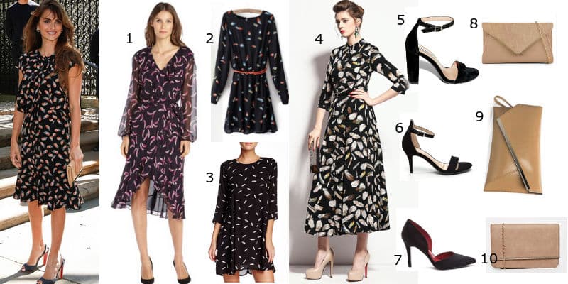 En esta oportunidad, escogimos el look con el que fue a ver un show durante New York Fashion Week. La actriz española lució un vestido de otra hispana súper reconocida: Carolina Herrera. Si bien el vestido es de la colección 2016 (y aún no está a la venta), el estampado de plumas (dress with feather print) está de moda ahora mismo y lo puedes imitar con algunas de estas prendas: