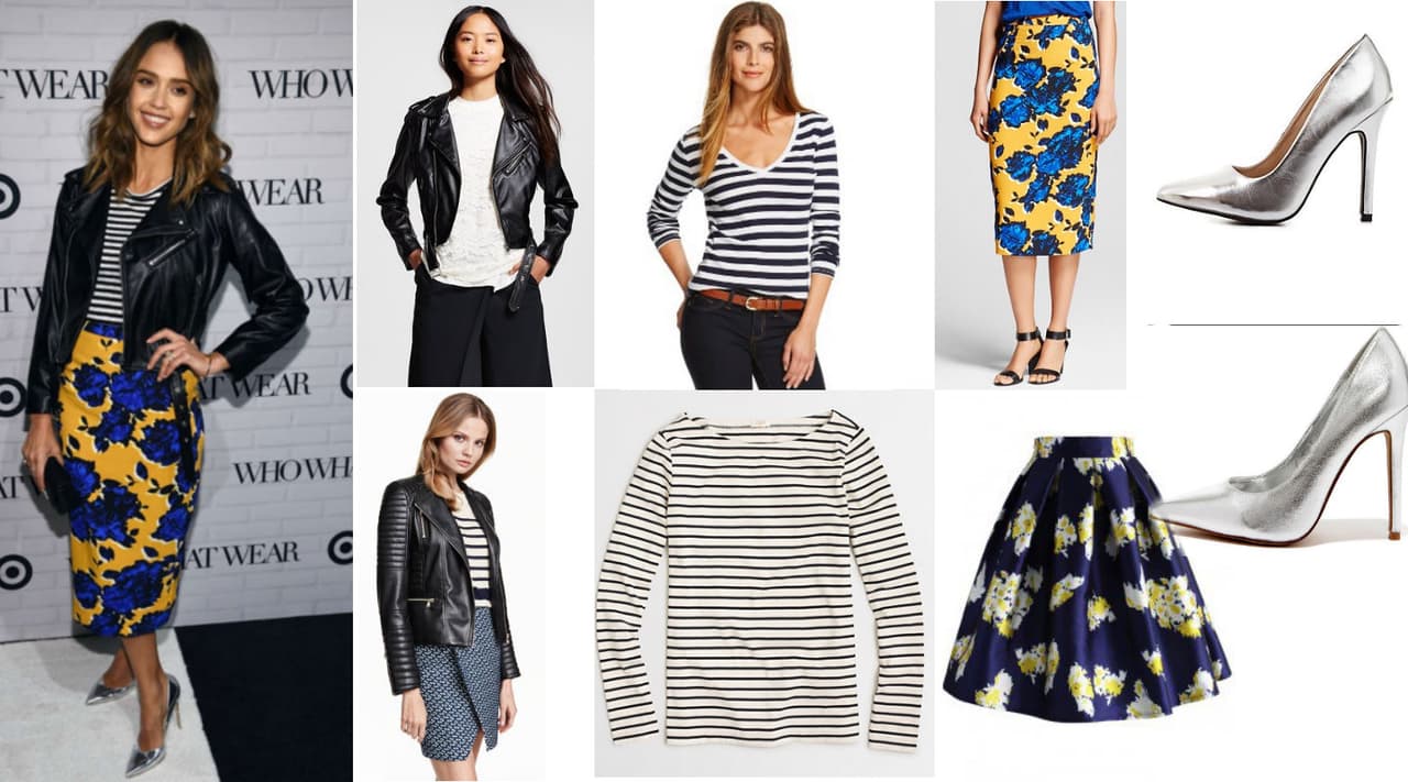 En este caso seleccionamos el look que Jessica escogió para el lanzamiento de la colección Who What Wear, de Target. Aquí Jessica combina una falda floral (un estilo que seguirá de moda en la primavera), una camiseta a rayas, que también es un clásico de cualquier clóset, una chamarra de ‘faux leather’, que prácticamente todas las mujeres tienen al menos una, y zapatos metálicos, con tacones.