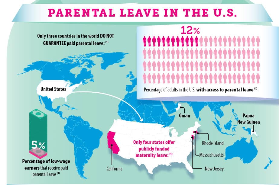 Estados Unidos es uno de los 3 países en todo el mundo, además de Papua New Guinea y Oman, que no garantiza por ley el derecho a una licencia por paternidad. Esto hace que sólo un 12 por ciento de adultos tenga una licencia por maternidad o paternidad reconocida en su trabajo y con algún tipo de pago.