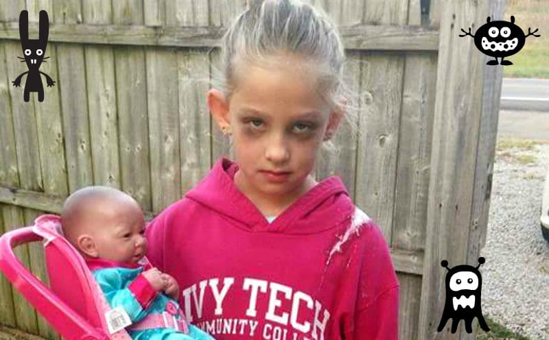 Lainie, la pequeña cuya foto ya tiene cientos de miles de likes en Facebook, se pintó ojeras bien marcadas y usó una camiseta con una mancha simulando un vómito, y no, su intención no era disfrazarse de zombie, sino de mamá agotada.