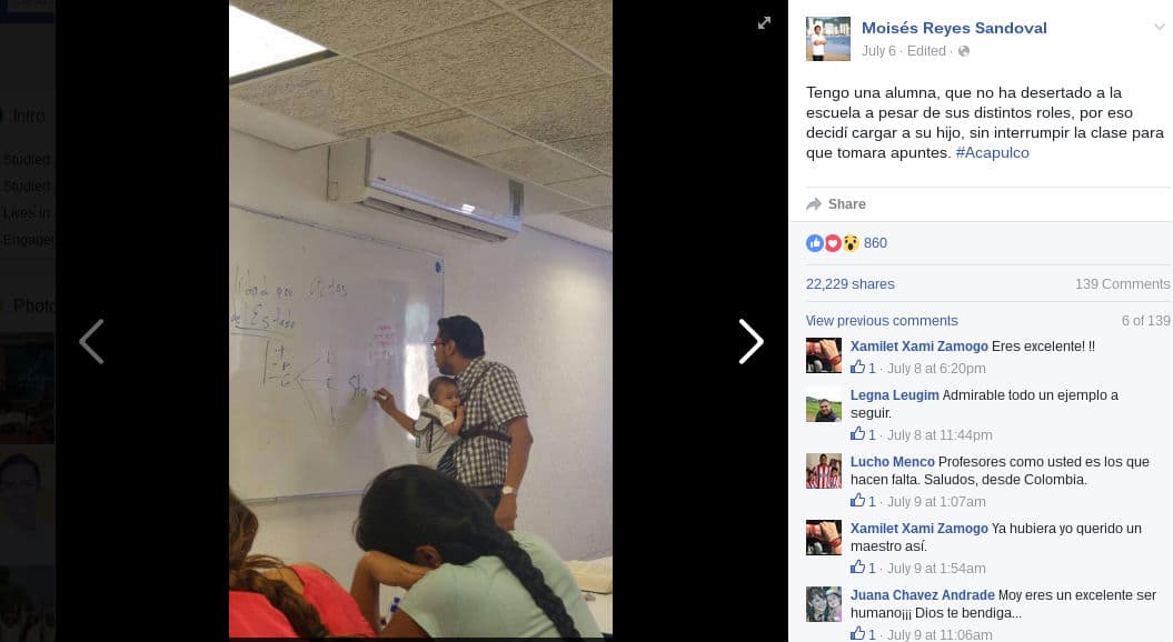 Moisés Reyes, profesor de Derecho de la Universidad Interamericana de Desarrollo, en Acapulco, publicó la foto en su página de Facebook con el mensaje: “Tengo una alumna, que no ha desertado a la escuela a pesar de sus distintos roles, por eso decidí cargar a su hijo, sin interrumpir la clase para que tomara apuntes. #Acapulco”-