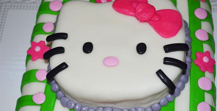 El fondant de marshmallow (masmelo o malvavisco) tiene una textura que permite crear múltiples y llamativos diseños para los pasteles. Son muchísimas las posibilidades y con la masa en tus manos pones a volar tu imaginación. Luego de la experiencia de elaborar el pastel de cumpleaños para mi hija, tuve la oportunidad de decorar un pastel basado en el personaje de Hello Kitty y regalarlo a una preciosa niña llamada Alivia. ¿Se imaginan su sorpresa?