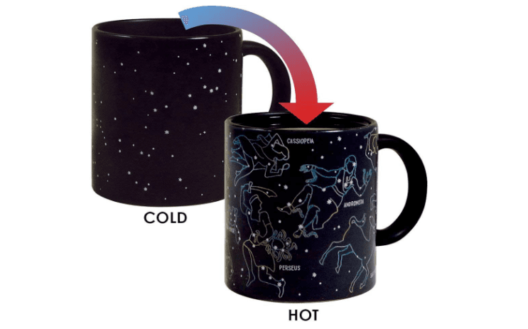 Cuando tome café o té por la mañana, no podrá evitar pensar en ti con estas magníficas tazas. Si su mente siempre está en el espacio, podrías darle esta que cambia de figura con el agua fría y caliente. ¡Le sacará una sonrisa!
