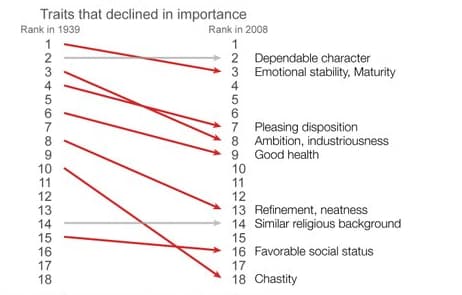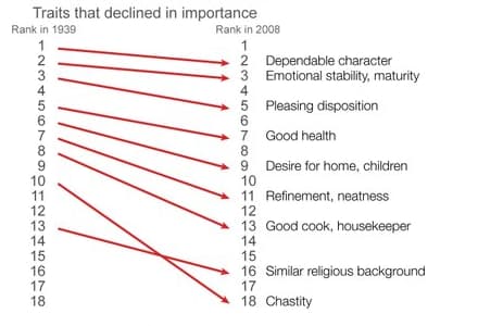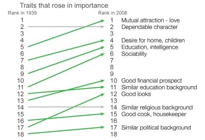 18 rasgos, rankeados en 1939 y luego en 2008. En ambos casos, la atracción mutua y los sentimientos pasaron del puesto 4 (en mujeres) y 5 (en hombres) al primer puesto. El atractivo físico ("good looks") también subió bastante en el ranking, en 1939 era la 12ava cosa más importante para las mujeres y la 17ava para los hombres. En 2008, son la 8va y 12ava respectivamente.