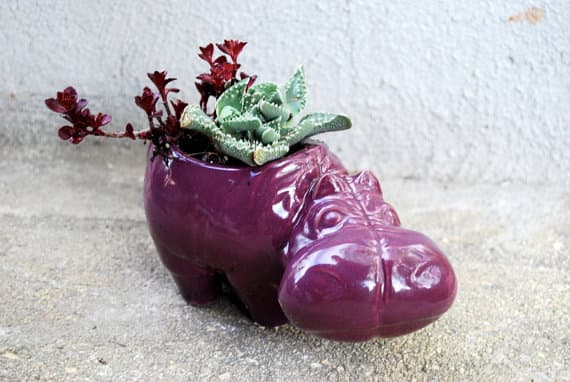 Si tu amiga recién se ha mudado o simplemente le encanta la decoración y quieres regalarle algo original y adorable para su casa, una maceta con forma es un regalo creativo como este hipopótamo violeta súper lindo.
