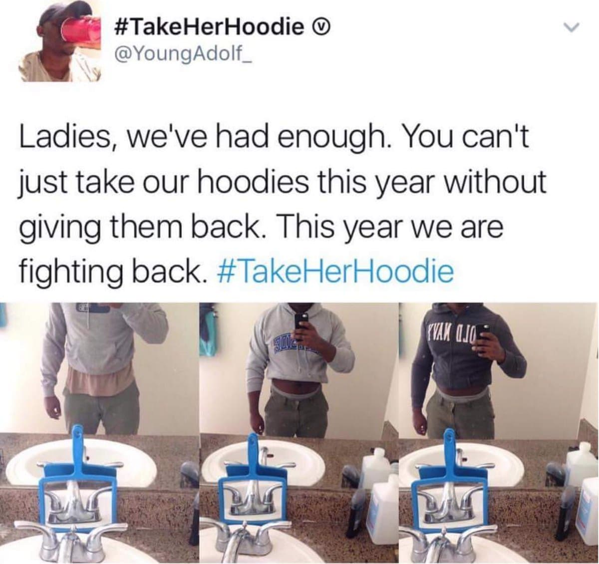 "Chicas, ya tuvimos suficiente. Ustedes no pueden tomar nuestra ropa y no devolverla. Este año les daremos batalla #TakeHerHoodie."