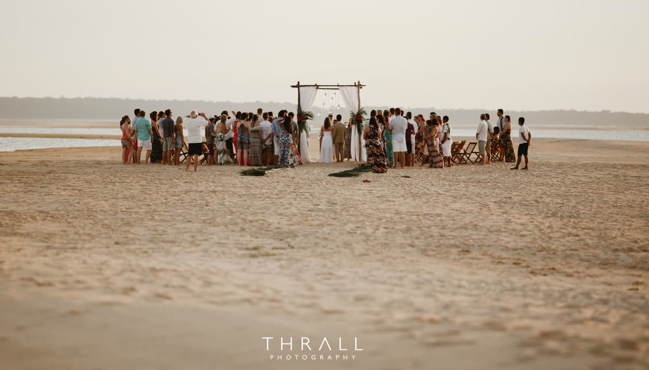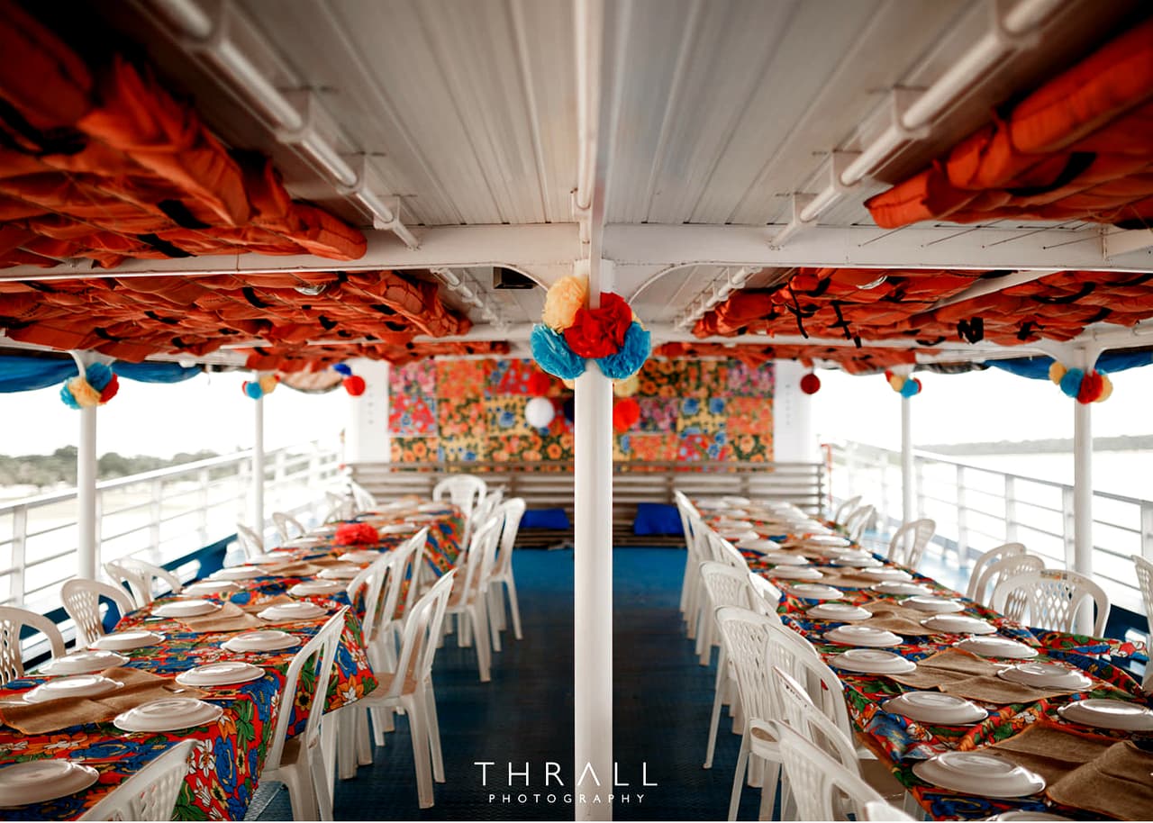 Y todo el mundo ayudó. La madre de Otávio, el novio, hizo los tapetes y las almohadas en los que las personas se sentaron en la playa. La madre de la novia se encargó de las hamacas y la decoración del barco. Lo que no se pudo hacer a mano quedó a cargo de la empresa Ello Decoração, de Santarém, responsable también de la limpieza de la playa después de la ceremonia.