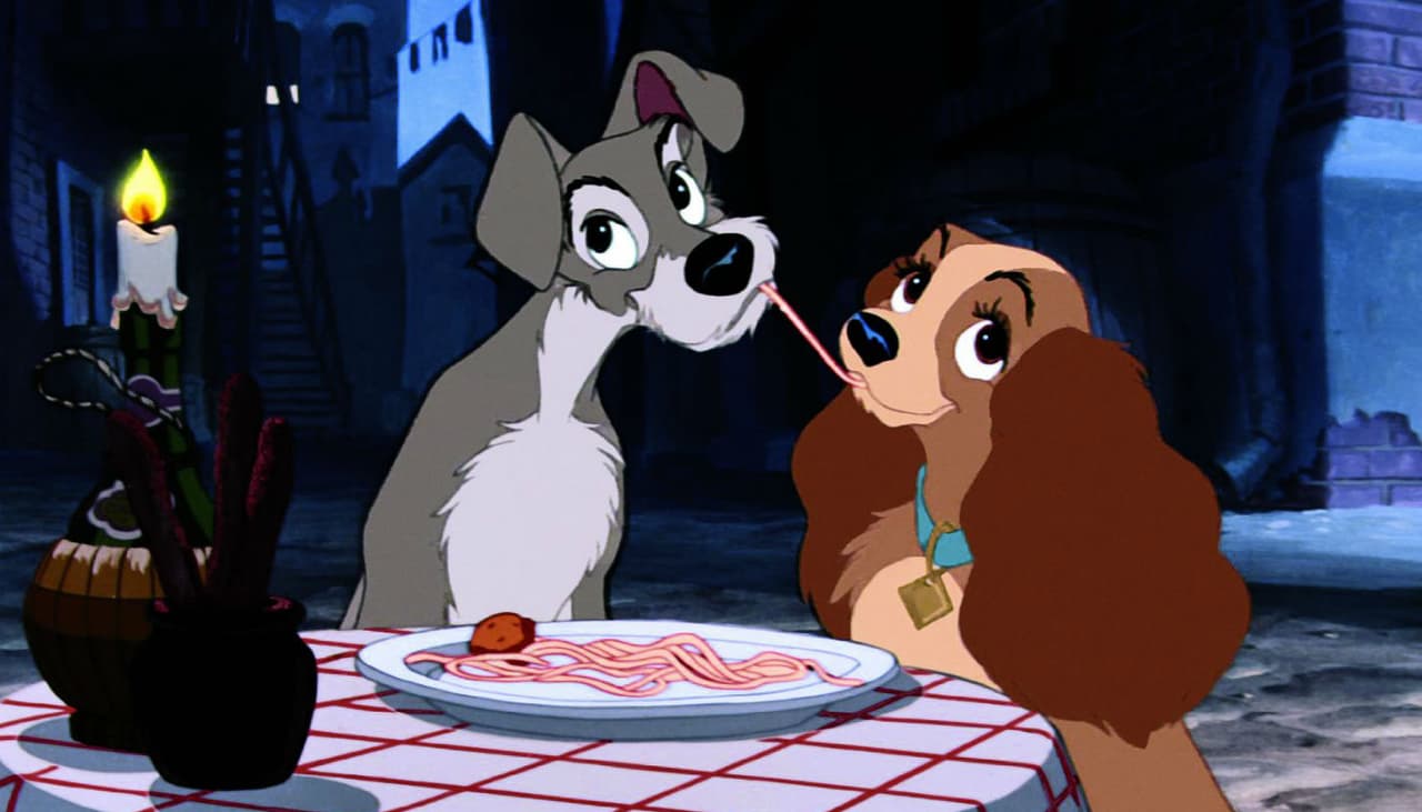 Esa escena tan tierna donde dos perritos comen spaguetti al mismo tiempo y de repente ¡pum! Ambos succionan la misma pasta, hasta llegar a un beso encantador. Algo que no pasaría en la vida real (lamentablemente).
