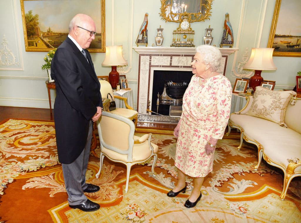 El miércoles 30 de mayo, Isabel se reunió con George Brandis, alto comisionado de Australia, y en la foto tradicional del saludo con los invitados se vio el adorable retrato. Además, la foto es inédita. Nunca antes la habíamos visto.