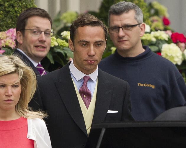 Familia de la novia: de parte de la novia, James, su hermano, vistió un traje negro con camisa celeste con cuello blanco, chaleco amarillo y corbata bordeaux estampada. Lamentablemente en la foto también salió otra persona que no sabía que iba a una boda real y optó por un buzo deportivo en azul... de lo mejor y lo peor en una sola toma...