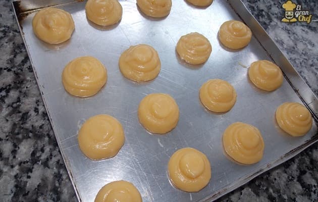 Coloca la masa en una manga pastelera y forma pequeños montículos sobre una bandeja para hornear previamente cubierta con una lámina de silicona o papel para hornear.