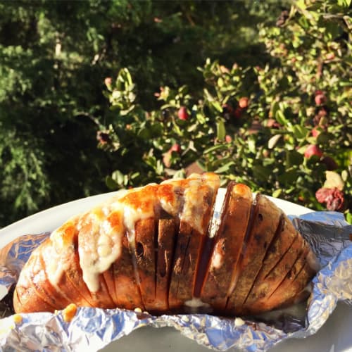 - Saca los camotes, quita el papel aluminio y rocía con queso rallado.