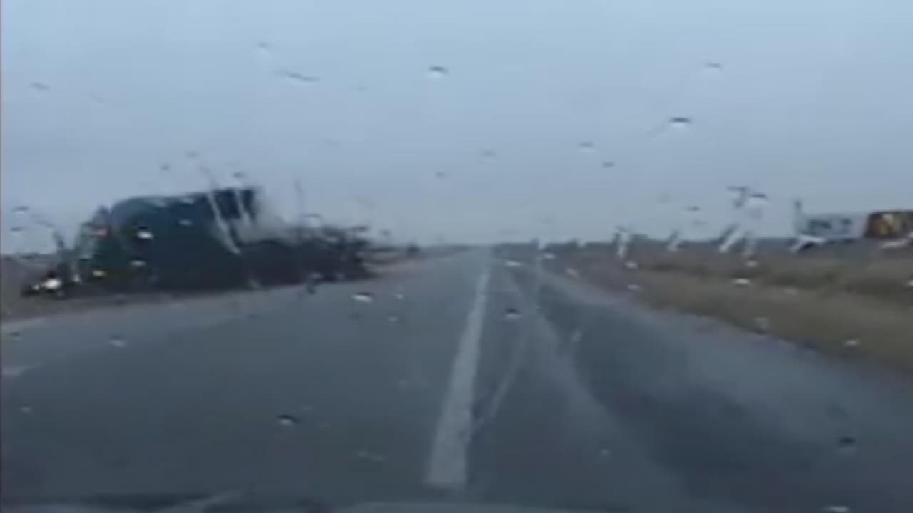 Desde la cámara de la unidad policial se puede ver cómo un camión que viene en la vía contraria pierde el control y pasa al canal por el que circulaba este oficial de Kansas.