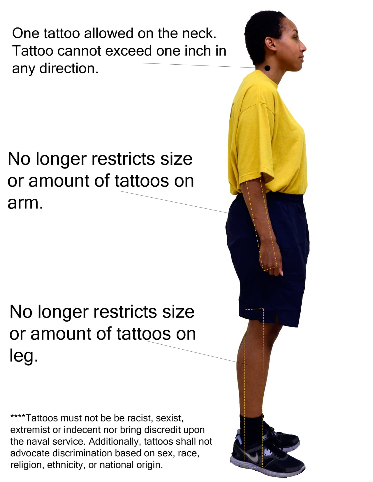 Las nuevas reglas, que entrarán en vigor el 30 de abril, establecen que está permitido tener varios tatuajes debajo del codo o de la rodilla, incluyendo las muñecas y las manos. Sin embargo, seguirán siendo prohibido los tatuajes “obscenos, sexualmente explícitos o que inciten a la discriminación por razones de raza, sexo, religión, nacionalidad o etnicidad”. Asimismo, estarán prohibidos los que tengan relación con alguna pandilla o grupo extremista.