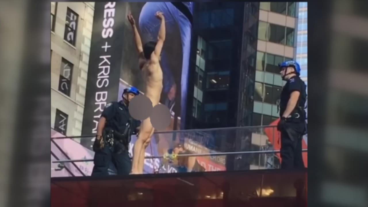 Este hombre decidió subir a una estructura de venta de tickets en pleno Times Square en la ciudad de Nueva York, totalmente desnudo. La policia acudió a la escena mientras el hombre bailaba y cantaba en la concurrida calle.