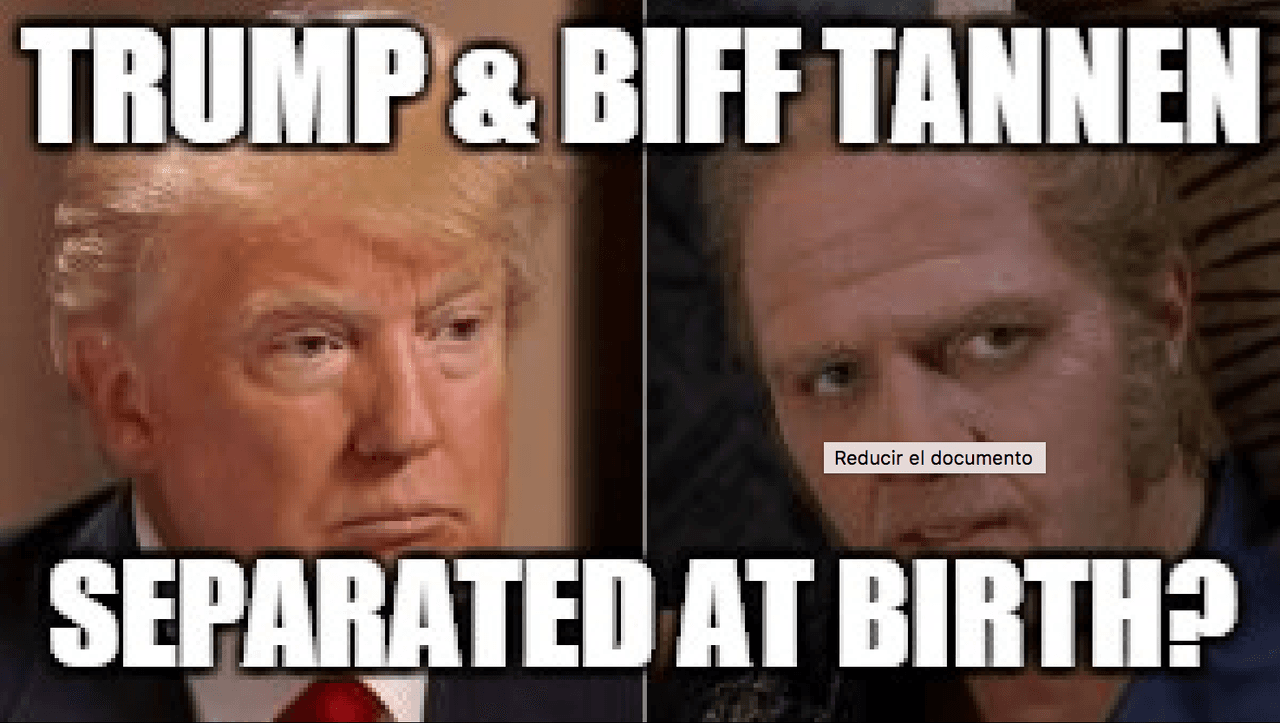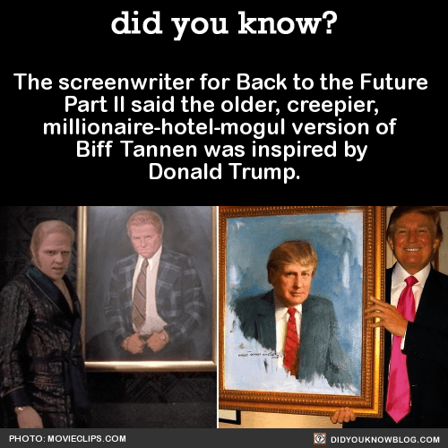Las comparaciones entre Tannen y Trump no son idénticas, pero causa gracia que en 1989 'Back to the Future II' haya hecho un chiste 27 años después de su estreno. ¿Qué tanto se inspiró Bob Gale, el guionista de la película, en Trump? "Pensamos en ello cuando hicimos la película!", dijo Bob Gale en entrevista con The Daily Beast. De hecho, la comparación ya es un clásico entre los fabricantes de memes.