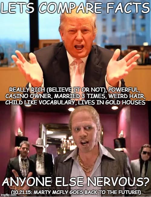 Comparemos: el Trump Plaza Hotel en Atlantic City tenía 37 pisos. Biff Tannen, el antagonista de la película 'Back to the Future II', construye un casino-hotel de 27 pisos, en donde antes quedaba la corte de Hill Valley. Según Jeb Bush, Trump quiere un casino en la Florida. Tannen, después de volverse millonario apostando, influye con dinero en la política y logra legalizar el juego en Hill Valley. Donald Trump ha dicho "tengo a gente negra contando mi dinero... lo odio". En la película, una familia afroamericana vive acorralada protegiendo su propiedad. "¿Quién te va a pagar tus cirugías plásticas?", le grita Tannen a Loraine, su esposa y mamá de Marty McFly. "¡No soporto tocar esos pechos plásticos!", le dijo Trump, al parecer, a su exesposa Ivana Trump.