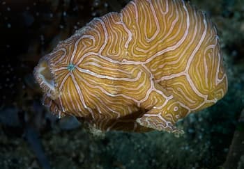 Histiophryne psychedelica . Entre todas las especies de pez sapo conocidas, ésta es una de las más extraordinarias. Fue descubierta en Indonesia y todo su cuerpo está recubierto por una serie de franjas blancas y anaranjadas que le confieren un aspecto realmente psicodélico. A pesar de lo llamativo, su curiosa vestimenta le sirve para pasar inadvertido en medio de los corales entre los que vive.