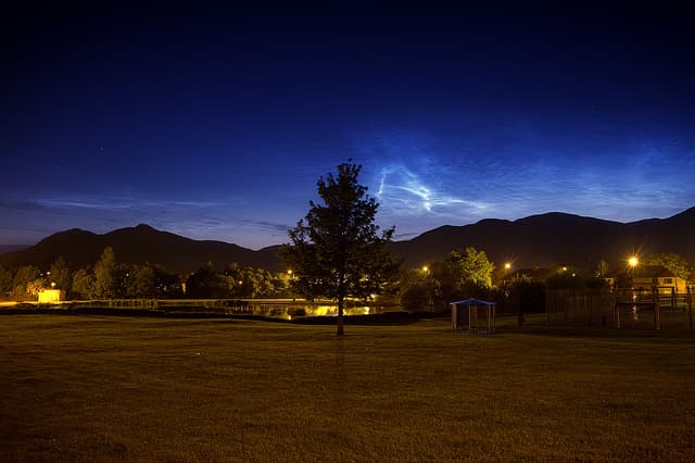 Las también llamadas nubes noctilucentes son muy raras; se forman a una altura de 82 a 102 kilómetros sobre la superficie de la Tierra y son visibles al final del crepúsculo. Parece que brillan al estar compuestas de cristales de agua helada y reflejar la luz del sol del otro lado del planeta.