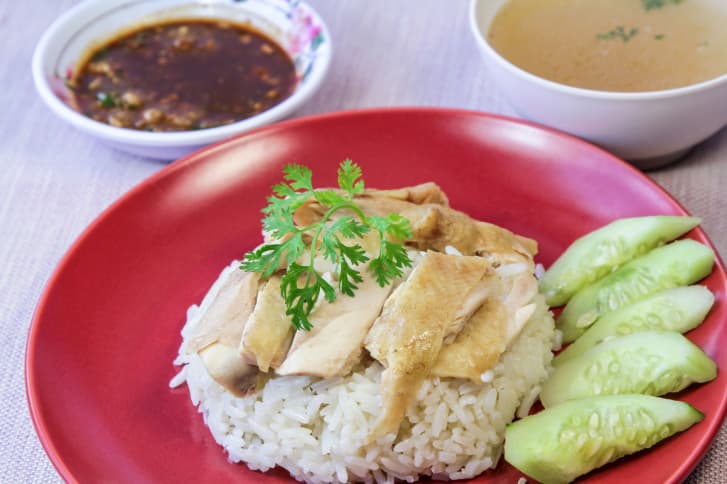 Básicamente, el plato es pollo hervido y servido con arroz y condimentos, como huevo o pepino. También hay versiones que se acompañan con sopa. ¡Quiero probar!