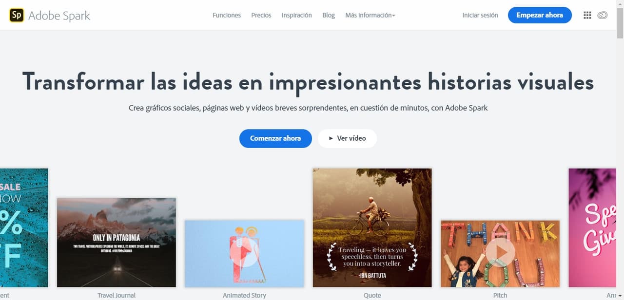 Adobe Spark es una herramienta multiusos. Puedes utilizarla para crear páginas web, así como para la edición de videos e imágenes, en especial para las que se distribuirán en redes sociales. Por ello ofrece la posibilidad de compartir lo que realices de manera instantánea. También cuenta con una galería, blog y plantillas para inspirarte, lo cual va de la mano con su enfoque de que todo el mundo puede aprender a crear sin necesidad de tener experiencia profesional.