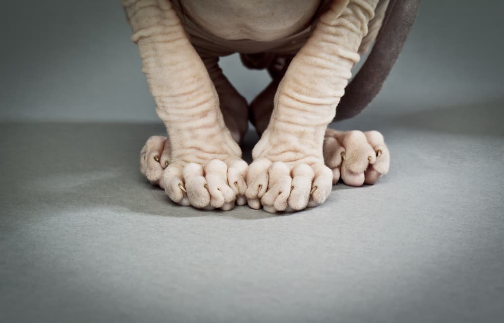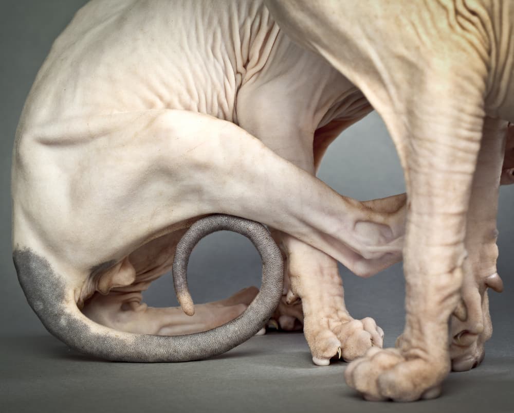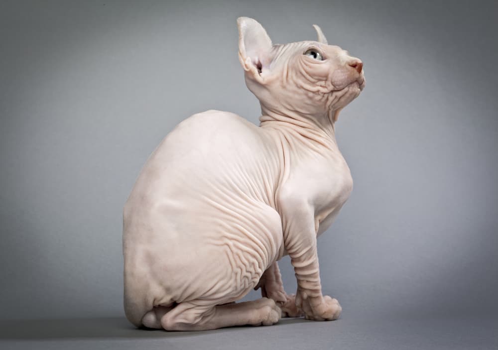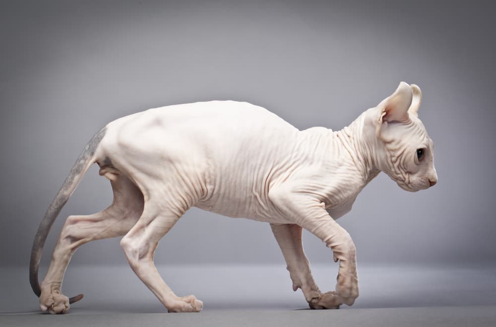 Los primeros en aparecer fueron los gatos esfinge, que se caracterizan su cuerpo delgado y musculoso, ojos grandes con forma de almendra y orejas de gran tamaño y sin pelos. La modificación del pelaje en estos gatos se debe a un gen recesivo, mientras que en los Don Sphynx y Peterbald, ambas razas originarias de Rusia, se debe a otras mutaciones de tipo dominante.