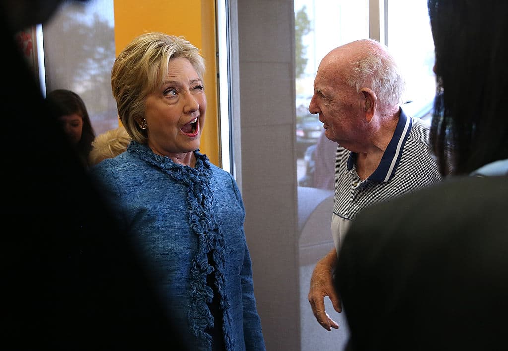 Eso parece preguntarle Sam Oser a Clinton durante su visita a un Dunkin Donuts en West Palm Beach, Florida.