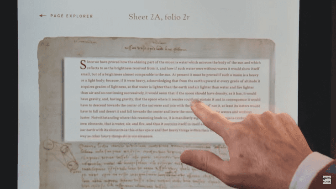 No, el Código Leicester no tiene códigos que «protegen secretos antiguos», según explicó Bill Gates en su blog. Pero no por eso es menos importante, sino que es «un tesoro científico». Contiene información de todo tipo: «Como la de cómo la sangre fluye a través del corazón».