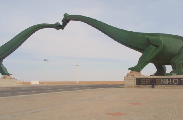 En la frontera entre China y Mongolia puedes ver a dos Apatosaurus besándose, mientras pasas por debajo. La zona es conocida por haberse encontrado cientos de fósiles de dinosaurios bien preservados. Además hay un museo y un parque de diversiones que destaca la fama de la ciudad.