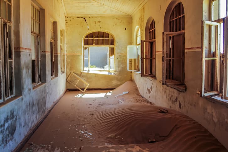 No lejos de la ciudad Lüderitz, en la costa de Namibia, nos encontramos con las casas desperdigadas de un pueblo fantasma que lo fue todo a principios del siglo XX. Kolmanskop no sólo fue una de las primeras colonias alemanas instaladas en los solitarios páramos de este país africano con el objetivo de convertir la extracción de diamantes en su principal motor económico, sino que su actual apariencia (fue abandonado en 1954) lo convierten en un lugar de exótica decadencia, con sus casas invadidas por las arena de un desierto que no olvida uno de los muchos impactos del colonialismo en el continente africano.
