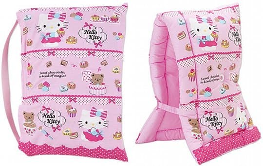Con un diseño lleno de imágenes de Hello Kitty, esta almohada también es capaz de proteger a quien la lleve en caso de incendios, evitando que el fuego o humo llegue a la cabeza. A un precio de 18 dólares, también existen diseños para varones y, son muy comunes en las salas de clases de Japón.