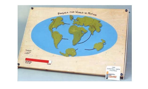 Su invento lleva el nombre de Pangea y funciona a través de una pila AA, que alimenta un motor que va moviendo y separando las piezas, reproduciendo la formación de los continentes de manera geológica y temporalmente correcta.