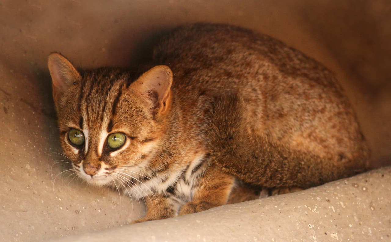 Este pequeño felino cuya característica principal es un pelaje cubierto con manchas de color óxido, se encuentra repartido entre India y Sri Lanka. El gato manchado de óxido no posee ninguna otra característica extraordinaria y cualquiera podría confundirlo con uno común y corriente.