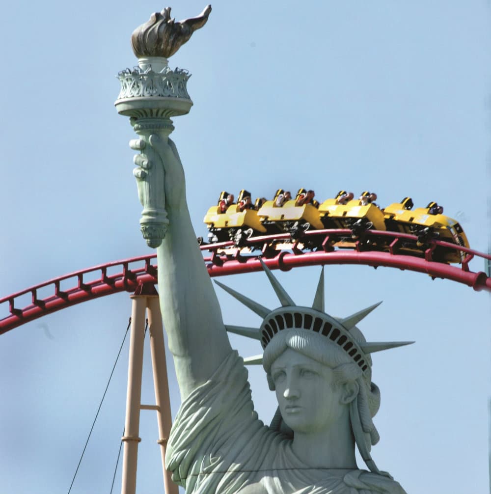 En los exteriores del hotel New York-New York hay una montaña rusa llamada The Big Apple Coaster capaz de dejar sin aliento hasta a los más atrevidos. El juego desciende 44 metros y luego da un giro de 180° a una velocidad de 108 km/h. A todos les va a encantar.