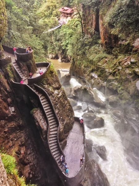 Retorcidas y marrones, las escaleras hacia el mirador del Pailón del Diablo, una de las cascadas más impresionantes de Ecuador surgidas del río Pastaza, supone la quinta esencia de arquitectura adaptada a una naturaleza salvaje y mágica.