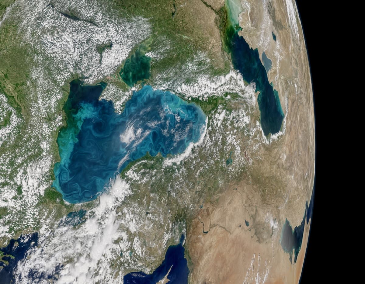 La imagen fue capturada por el satélite Aqua de la NASA. Se trata de la floración de fitoplancton sobre el Mar Negro.