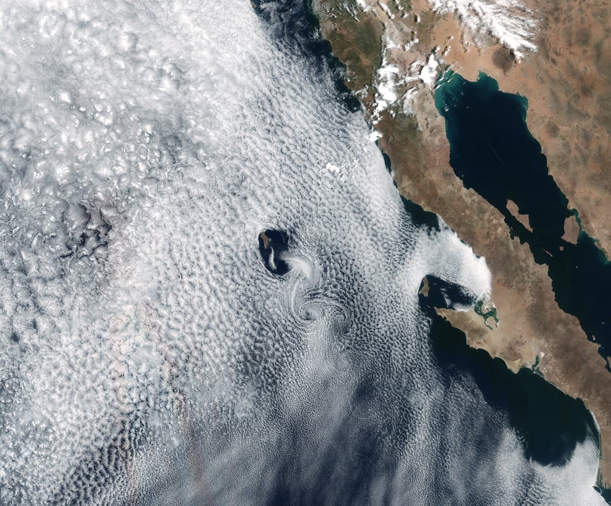 La Suite de Radiómetro de Imágenes Infrarrojas Visibles (VIRRS) del satélite Suomi NPP tomó fotografías de la formación de nubes largas y en espiral sobre Isla Guadalupe.