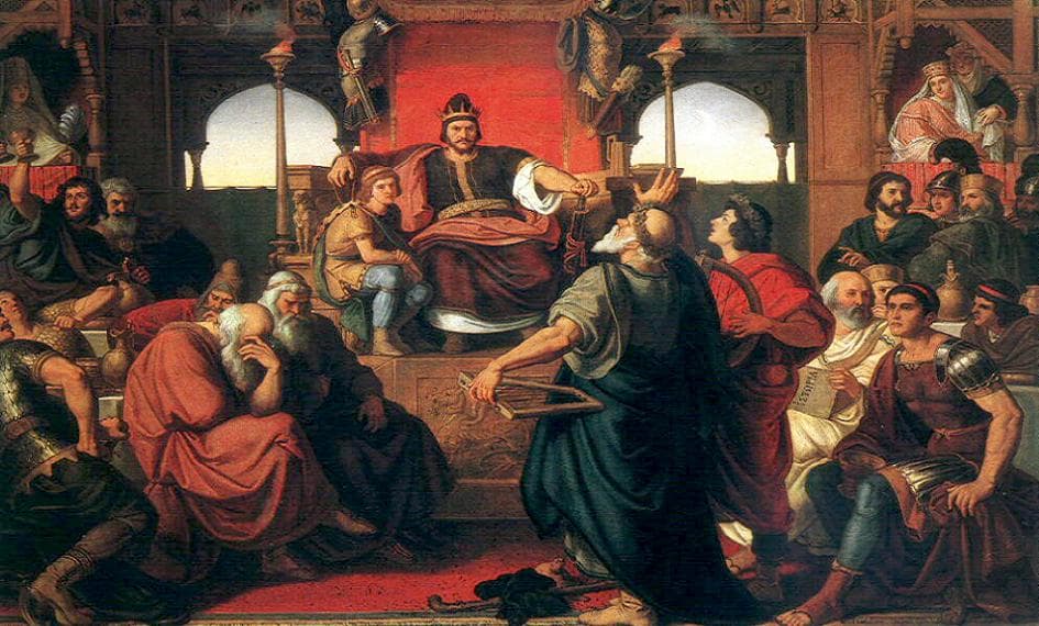 El destacado estratega guerrero y famoso villano era conocido por su moderación, tanto comiendo como bebiendo. Cuando en el 453 d. E. C. se casó, quiso hacer una excepción, comiendo abundantemente y emborrachándose. Se acostó tan ebrio que le sobrevino una hemorragia nasal y ni cuenta se dio cuando literalmente se ahogó en su propia sangre.