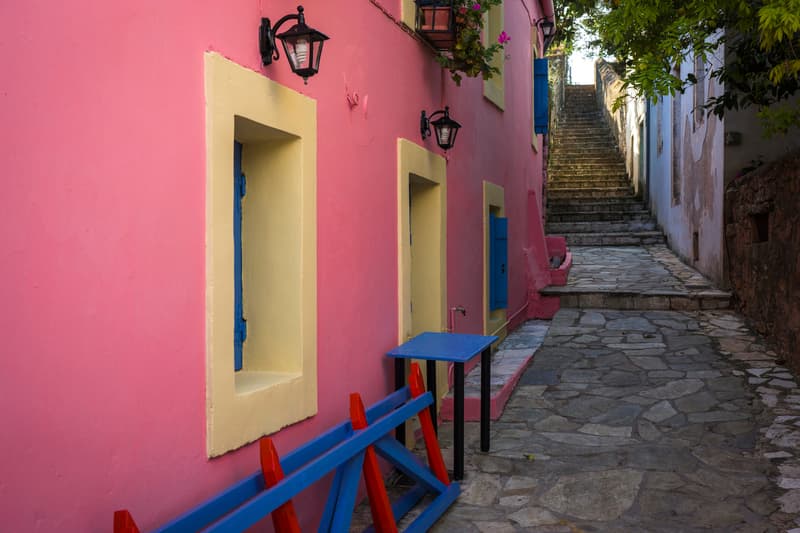 Aunque el blanco y el azul sean los colores que más predominen en las islas griegas, especialmente en las Cícladas, el rosa es también un color recurrente en lugares como Fiskardo, pueblecito marinero de la isla de Kefalonia, en el mar Jónico. Casitas en cuyos portales se extienden las terrazas azules y la buganvilla cae de sus balcones conformando una de las estampas más idílicas del Mediterráneo.