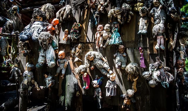 Este lugar sí que luce como escenografía de una película de terror. Esta es una isla artificial cuya dueña, al encontrar una niña muerta cerca del canal, comenzó a recolectar muñecas y juguetes, y a distribuirlos por la isla para protegerse de los espíritus malignos. ¿Tú quieres ir?