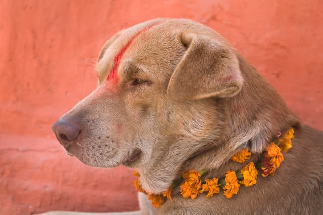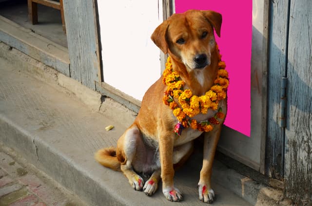 Es una fiesta en honor a los perros que se celebra en Nepal durante otoño. Tanto los canes callejeros como los de compañía, son tratados con las máximas atenciones y tienen a disposición deliciosas comidas. Es como una especie de fiesta masiva de cumpleaños de perros y cada ejemplar recibe un collar de flores y una marca roja en la frente que es un símbolo de dignidad.