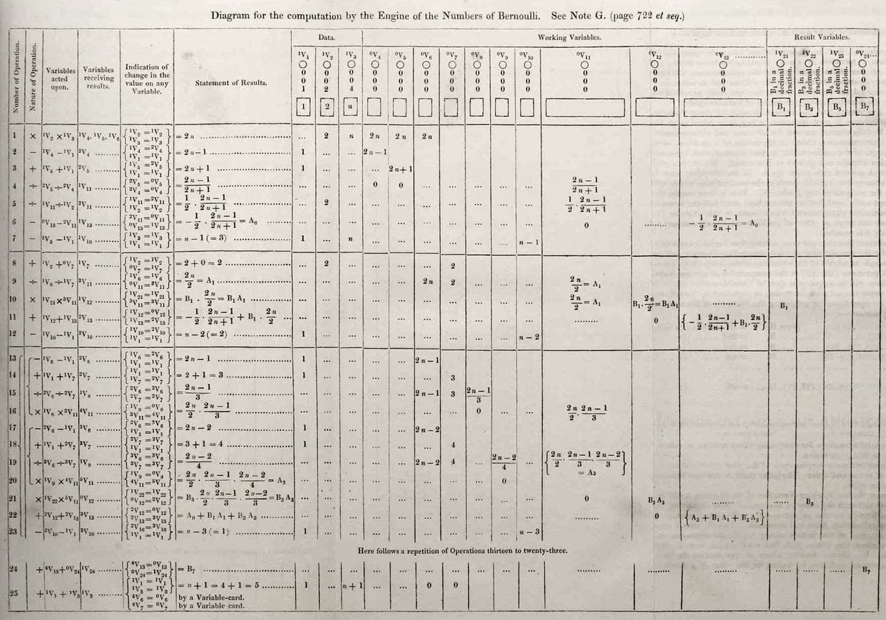 En una de las notas, Ada Lovelace describió un algoritmo para la máquina analítica que computara números de Bernoulli, que pasó a ser considerado el primer algoritmo específicamente apto para ser implementado en un computador.