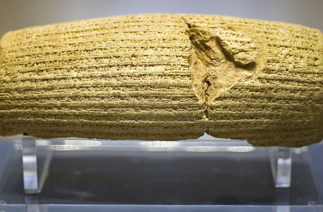 Es una pieza de arcilla donde se encuentran escritas palabras en nombre del rey persa Ciro el Grande. Habla sobre la repatriación de las personas deportadas y la restauración de los santuarios de culto. Es comúnmente nombrado como la primera declaración de Derechos Humanos, aunque otros dicen que nunca hace alusión específicamente a los judíos.