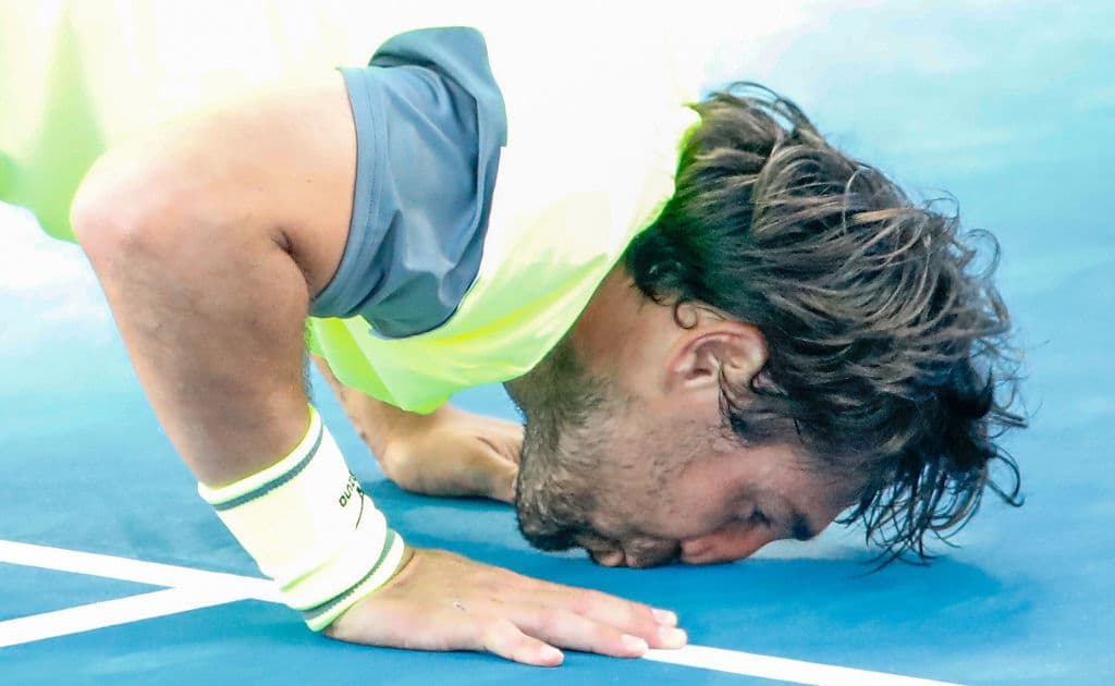El tenista ganó su primer partido y celebró besando la cancha en Melbourne.