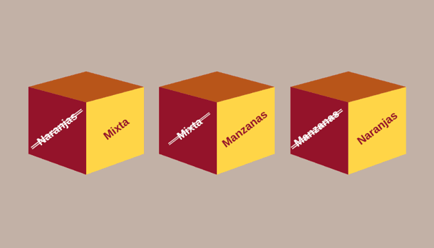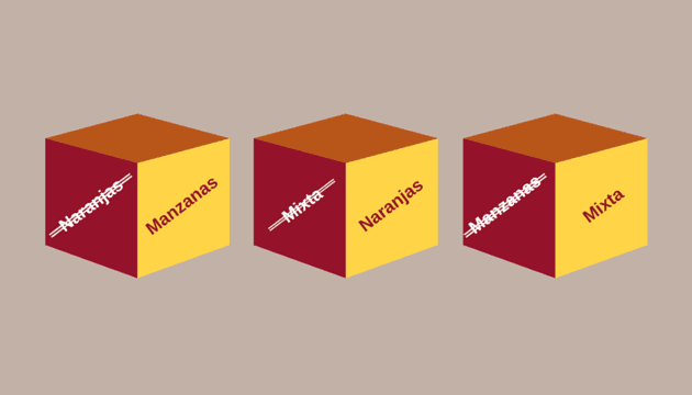 Pero, como decíamos, esta no es la única solución. Si Mariana no hubiese elegido abrir la caja mixta en primera instancia, igual podría haber descubierto cómo corregir las etiquetas de las cajas sin sacar más frutas. Eso sí, habría necesitado suerte. Imaginemos que eligió abrir primero la caja etiquetada como «manzanas»: