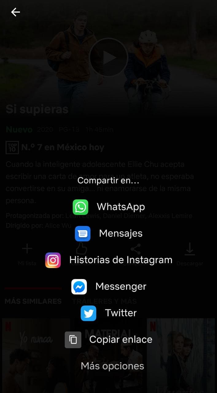 Lo principal es tener una suscripción a Netflix activa y la aplicación del servicio instalada en el celular con WhatsApp. Dentro de la aplicación, hay que elegir el contenido que se quiere ver y aparecerá la opción ‘Más’ o ‘Compartir’, dependiendo del dispositivo.