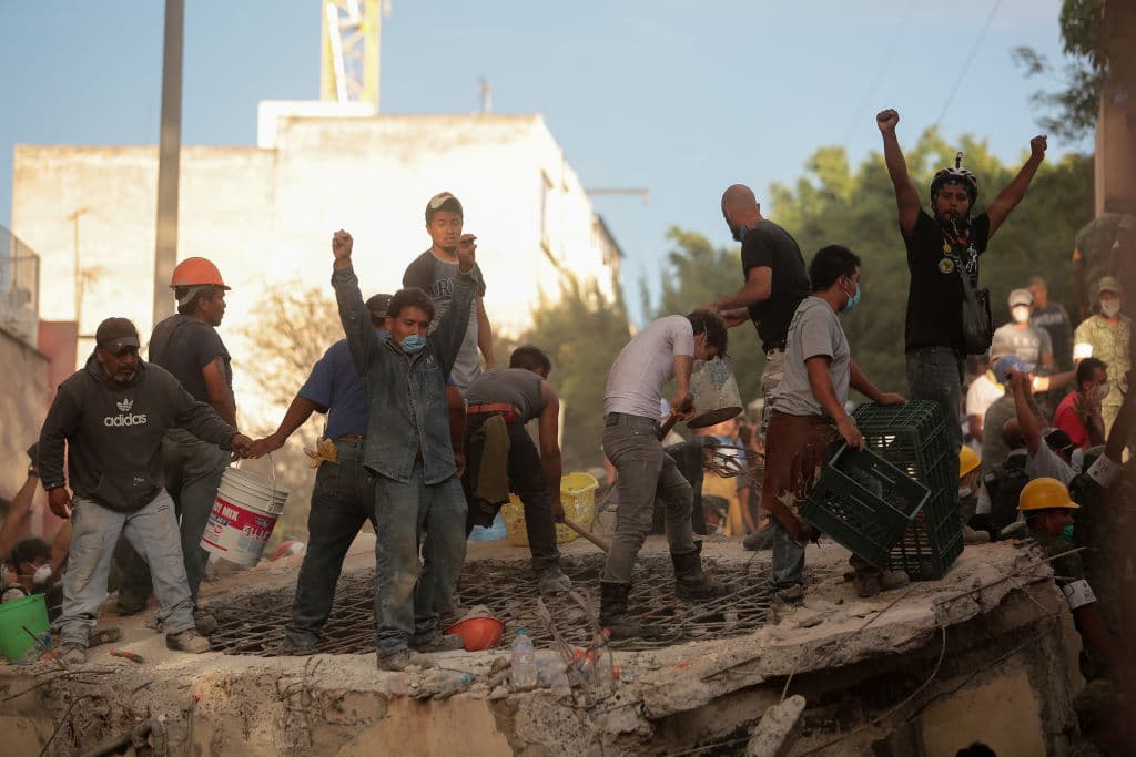 En diversas imágenes de medios y redes sociales, logra observarse una seña particular, el puño levantado del personal de protección civil así como rescatistas.